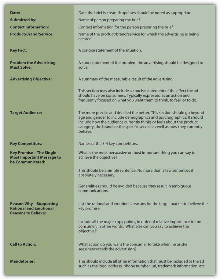 The creative briefDocument that outlines the information and objectives to inspire the creative idea, including what the advertising is trying to achieve, the main idea to be communicated, and the target audience. is a document that outlines the information and objectives to inspire the creative idea. Creative briefs may take different forms and include a variety of elements, including describing what the advertising is trying to achieve, identifying the main idea to be communicated, and outlining the target audience for that idea.