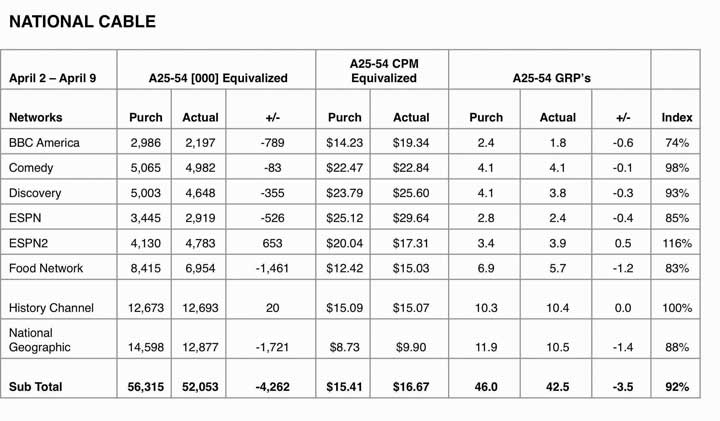 National cable metrics from the msnbc.com campaign show the planned CPM versus the actual CPM. ESPN2 and History Channel met or exceeded purchased impressions.